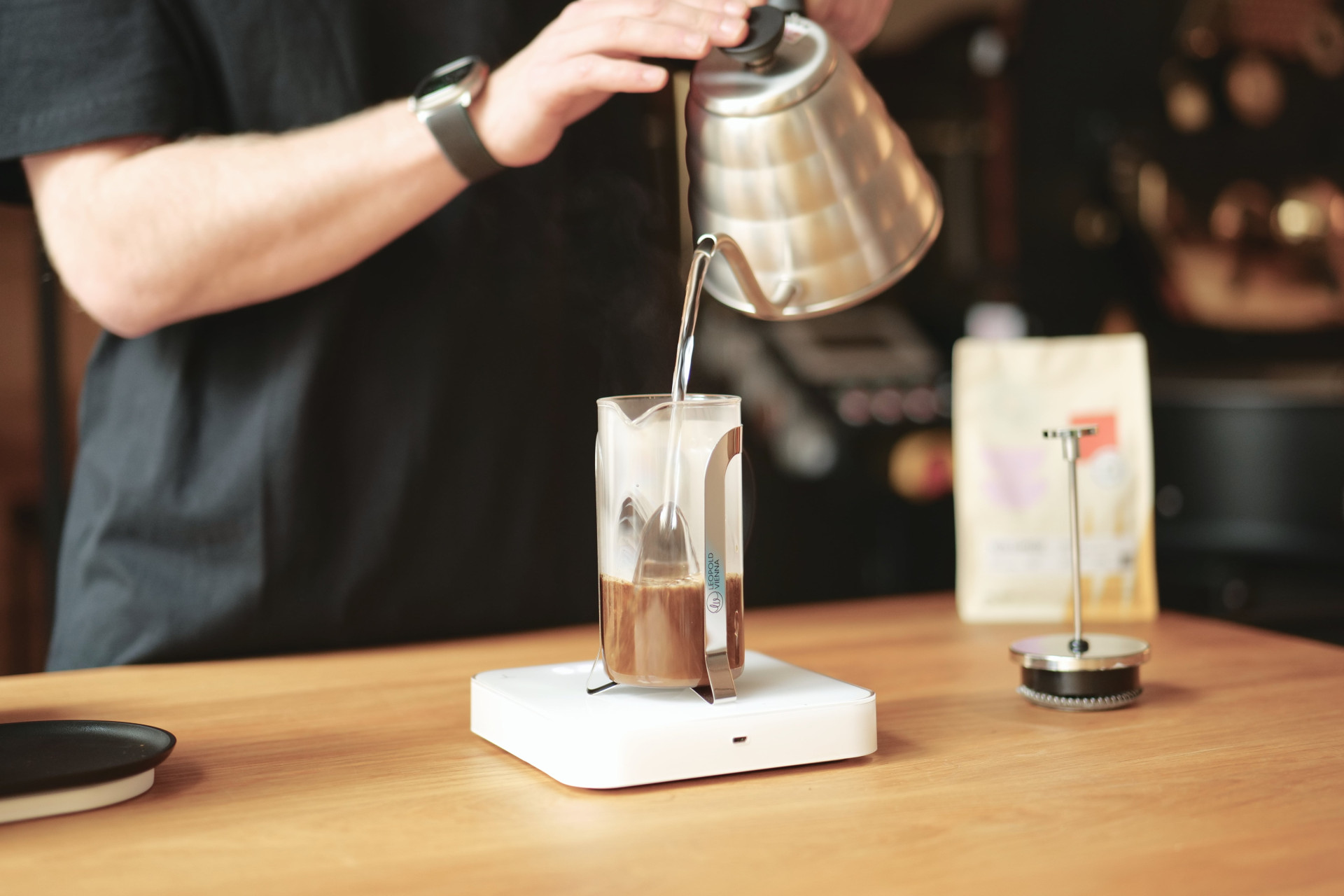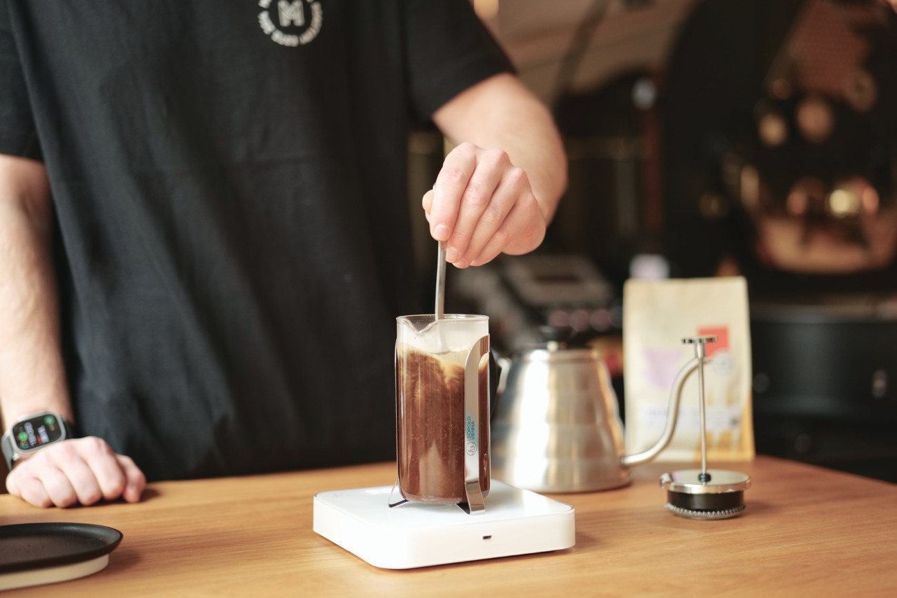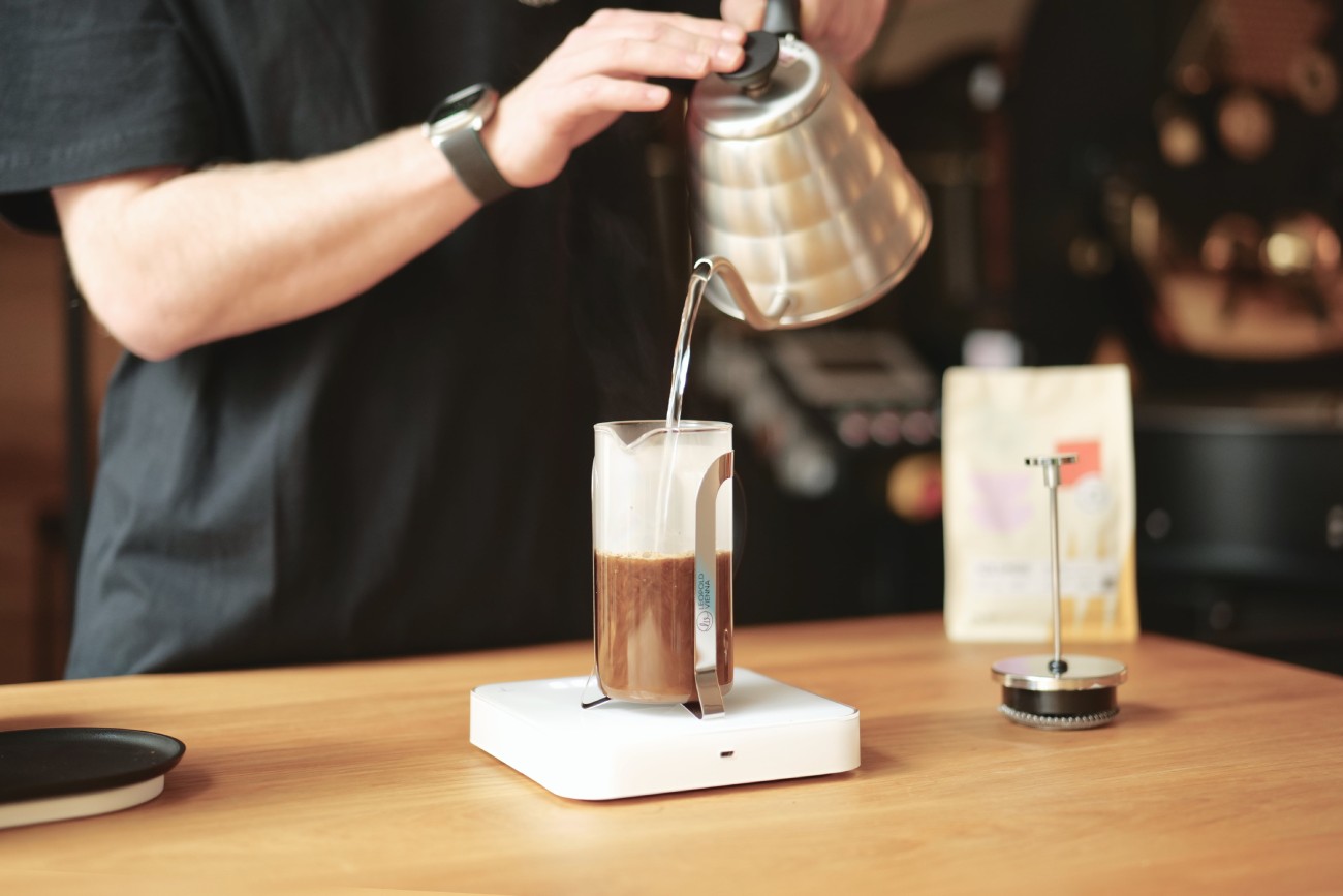 Heat the water to an optimal temperature of 93-96 °C. Add 19 g of coffee to the French press, pour in 300 ml of water, and stir.