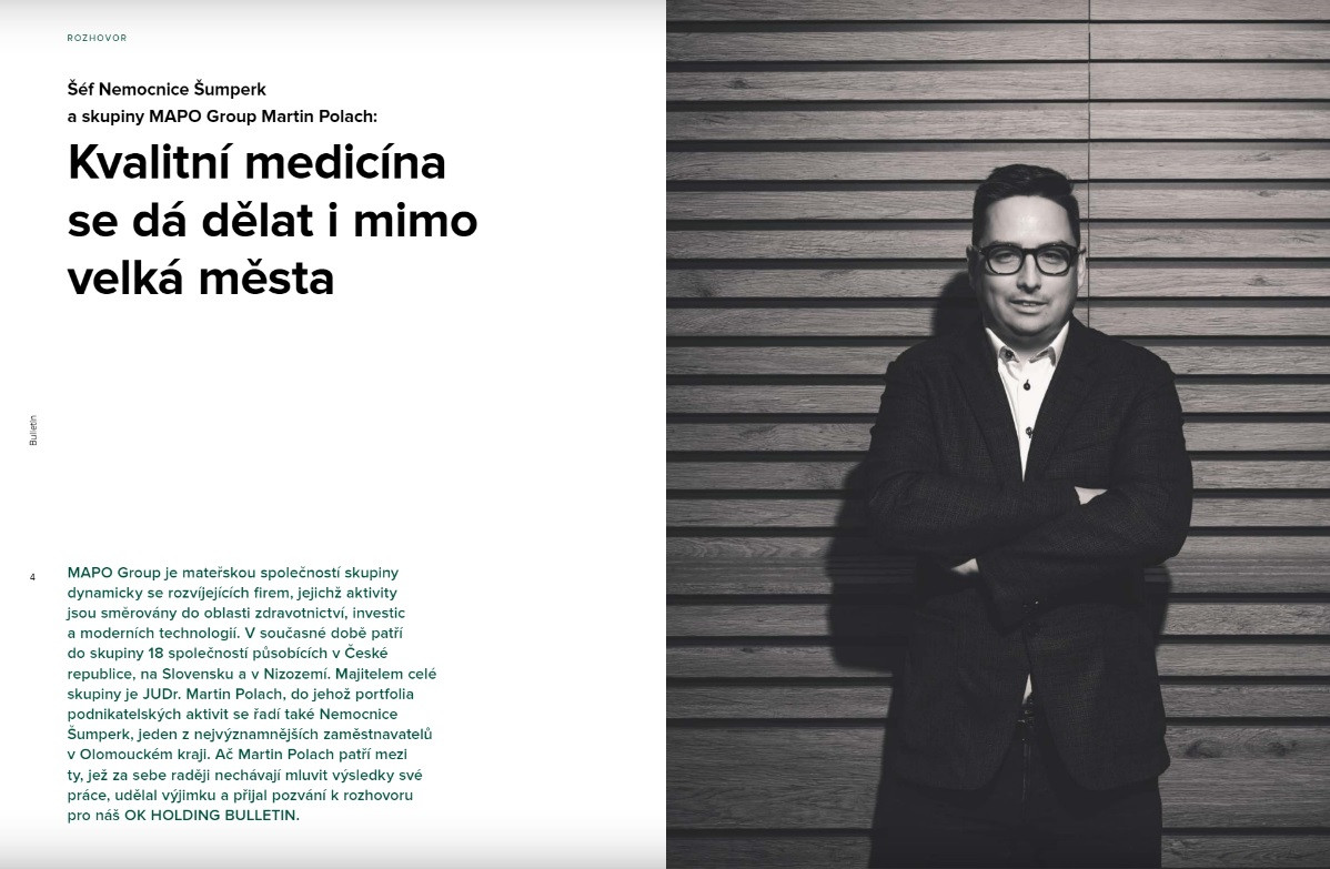 MAPO Group is a dynamic group of companies focused on healthcare, investments, and modern technology. We specialize in seeking long-term valuable investments in the healthcare sector, where we operate a network of private clinics in the Olomouc Region offering modern medicine and day surgery. Our goal is to provide top-notch healthcare through innovative technologies and an individual approach to patients.